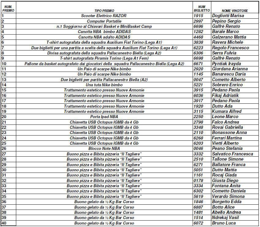 L’Associazione Sportiva Dilettantistica Promosport al fine di promuovere la propria associazione e per far fronte alle esigenze finanziarie dell’associazione stessa, grazie all’adesione di partner privati organizza una Lotteria con l’estrazione di n. 40 premi. Di seguito è fornita la lista dei premi: